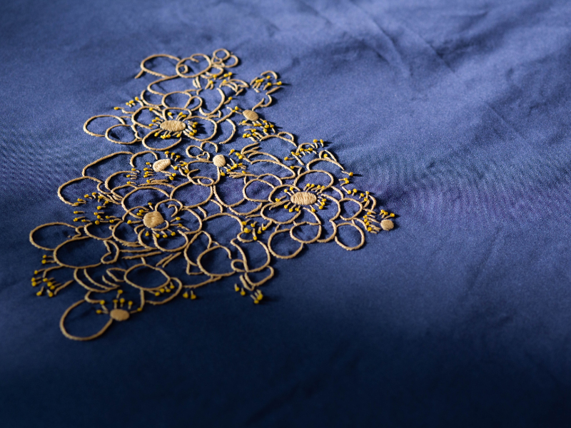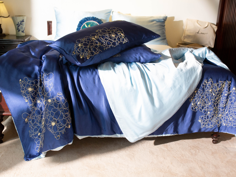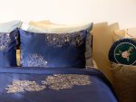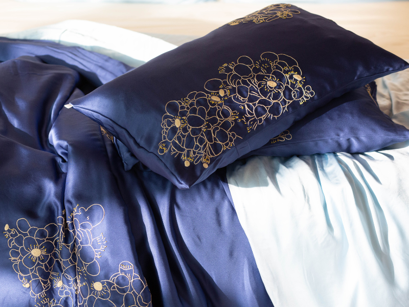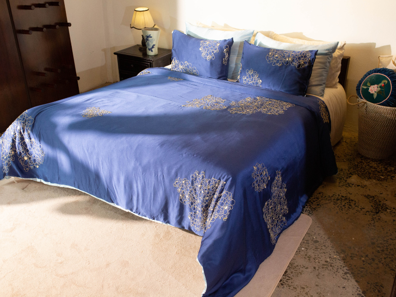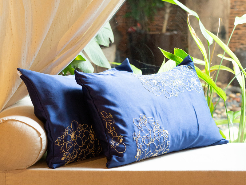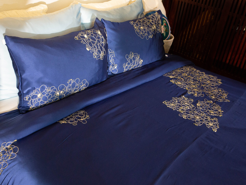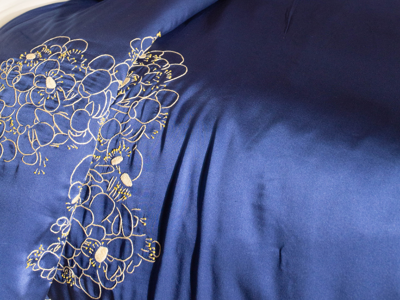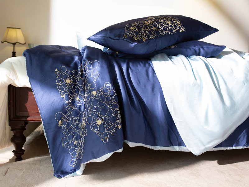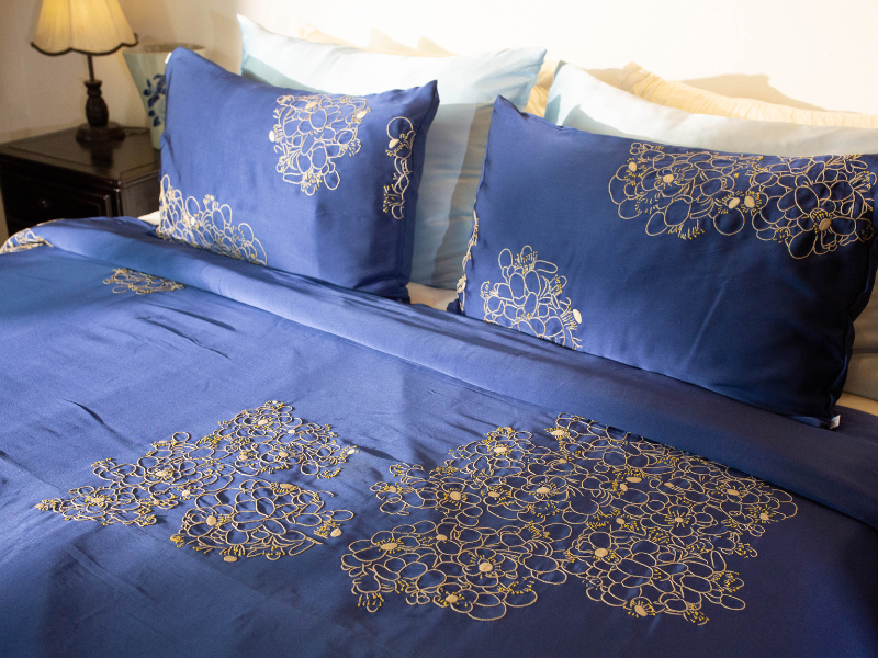 Thiết kế “𝐇𝐨𝐚 𝐛𝐮̛𝐨̛̉𝐢 𝐭𝐡𝐚𝐧𝐡 𝐲𝐞̂𝐧” được làm từ vải lụa tơ tằm Bảo Lộc, phần ruột chăn bên trong là lớp bông kết từ hàng triệu sợi tơ tằm thiên nhiên óng ánh. Họa tiết trên chăn được thêu tay hoàn toàn theo thiết kế độc quyền của Levusilk – một trong ba mẫu thuộc bộ sưu tập Hương Bưởi.