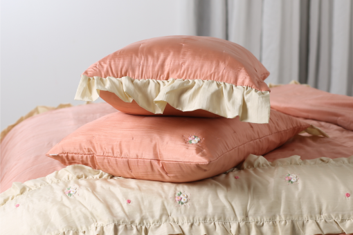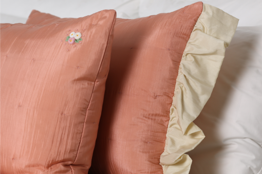 Vỏ gối được thiết kế 2 lớp lụa, 2 lớp bông D-seal 1.5oz và 2 lớp lót cotton 100%, khâu tay thủ công